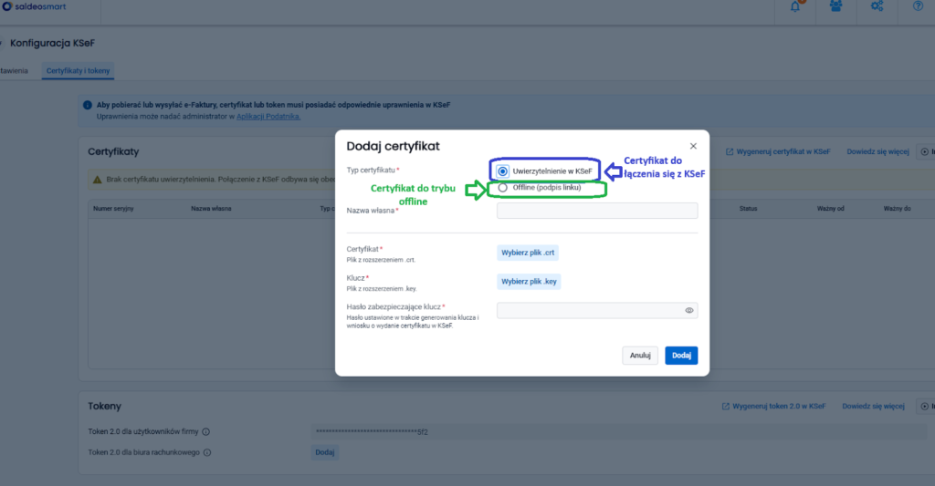 🔹 2. Certyfikat – uwierzytelnienie w systemie KSeF. Certyfikat do bieżącej komunikacji z KSeF