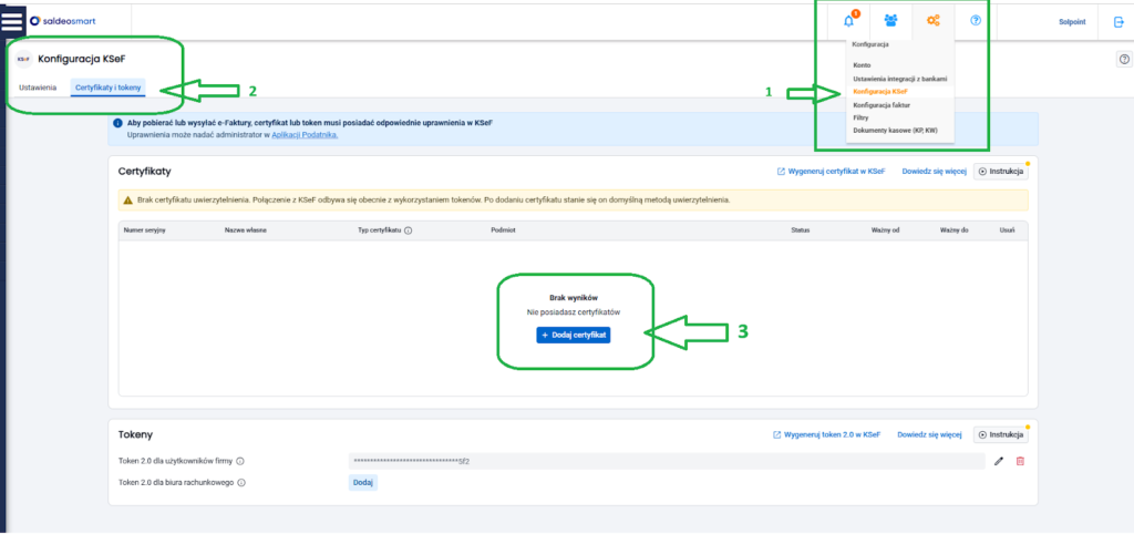 Po wygenerowaniu trzeba certyfikat wgrać do systemu Saldeo. Wgranie następuje z poniższego poziomu aplikacji.